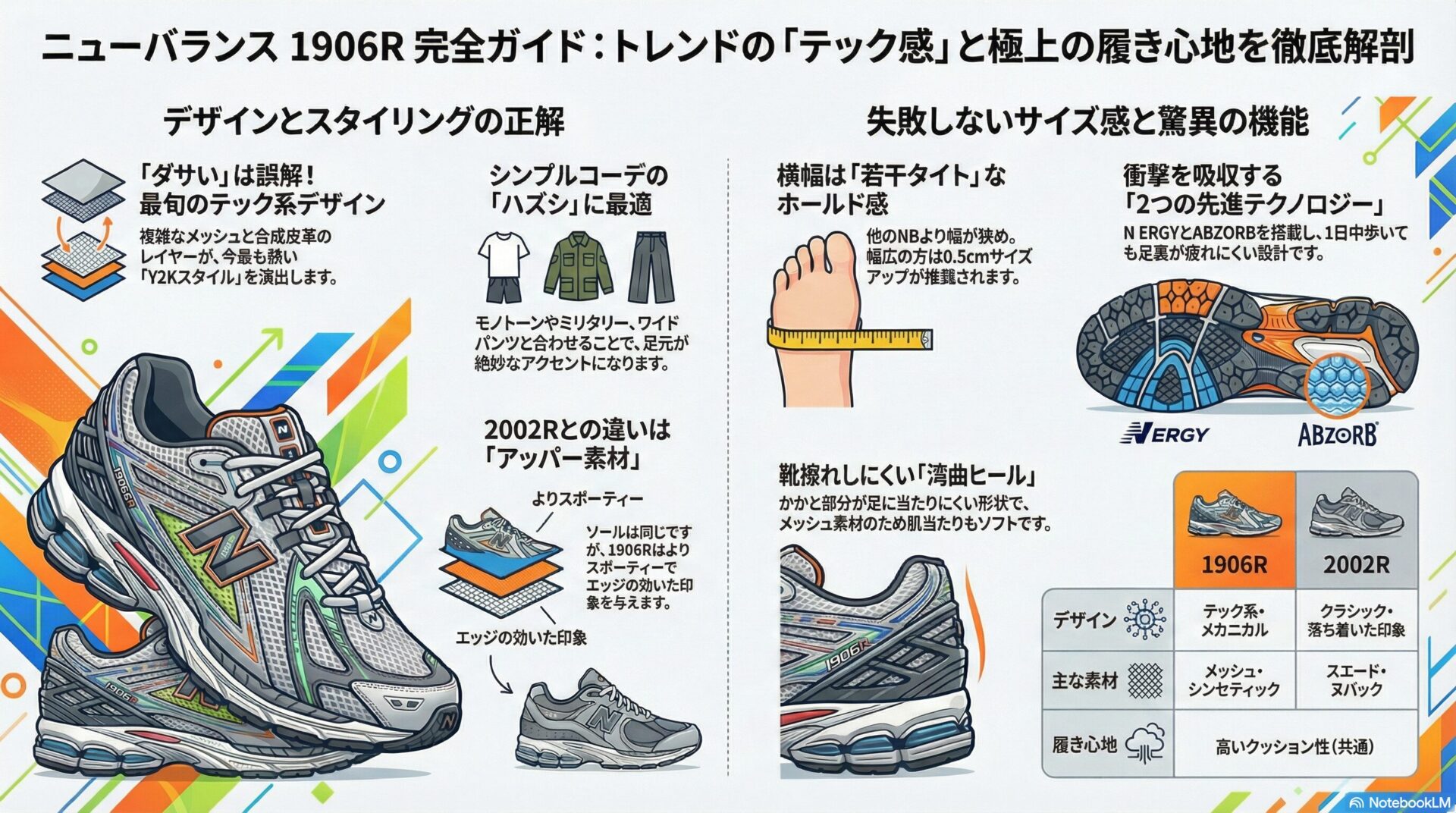 2002Rはスエード素材が多く、少し落ち着いたクラシックな印象。一方、1906Rはメッシュとシンセティックレザーを多用した、2000年代風のY2K(テック系)デザインが特徴。より今っぽく、エッジの効いたスタイルを楽しみたいなら、間違いなく1906Rがおすすめ。