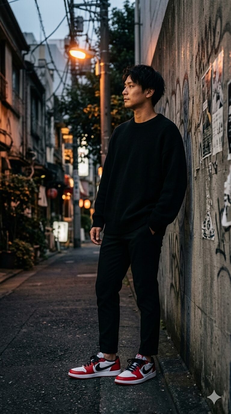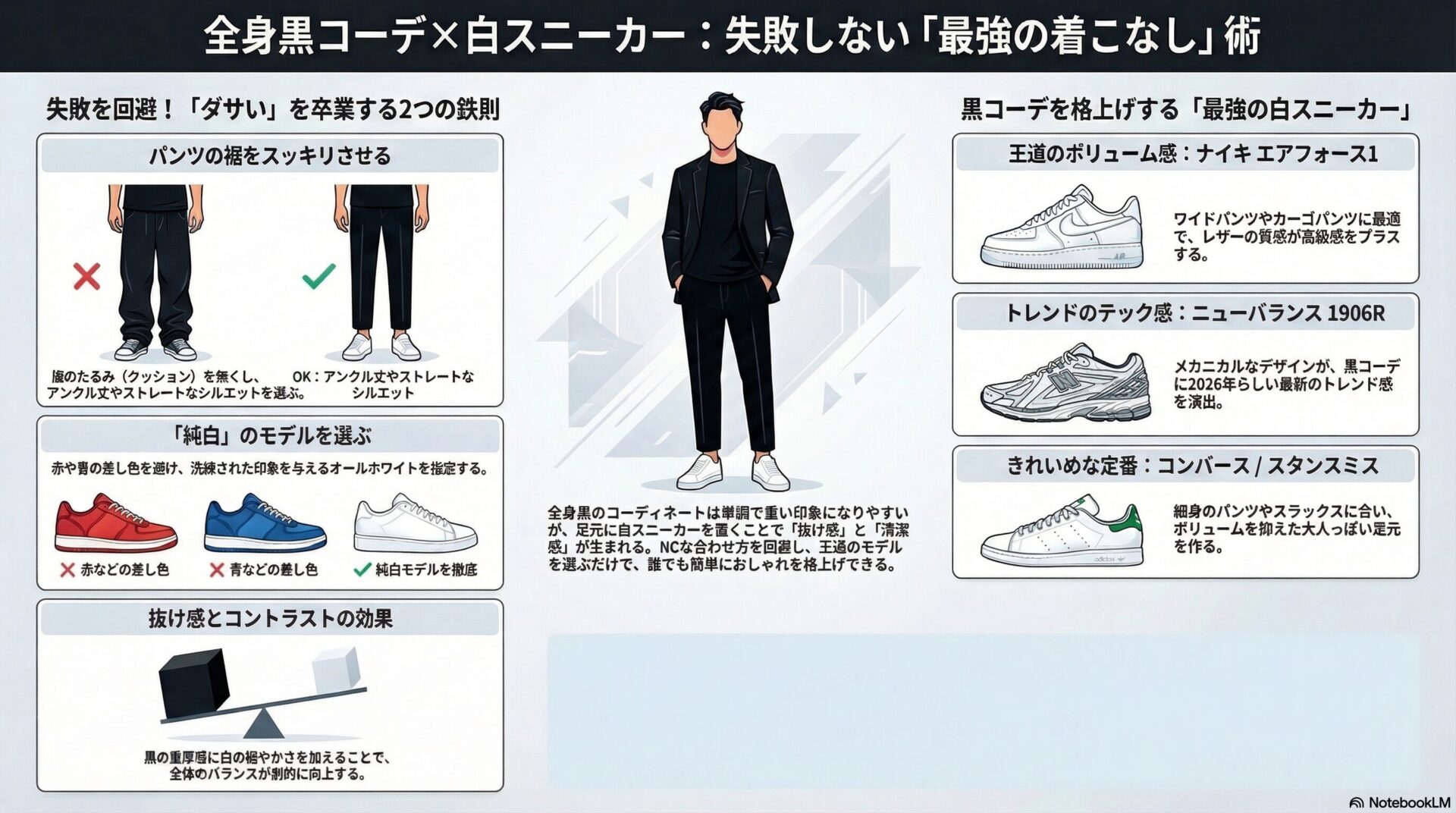 💡 この記事では、絶対にダサくならない着こなしのコツと、黒コーデに劇的にハマるおすすめの白スニーカーを紹介する。定番の真っ白なエアフォース1などは常に品薄だから、まずは自分のサイズがあるかチェックしておこう!